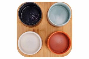 Deze stijlvolle aperitiefset is een echte blikvanger op iedere tafel. De set bestaat uit een houten serveerplank van 22 x 22 x 7 cm met daarop vier keramische potjes in verschillende kleuren: zwart, wit, groenblauw en oranje.