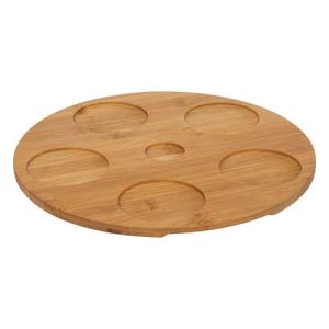Aperoset met 5 schaaltjes in zwart porselein op een houten plateau.