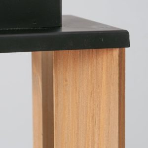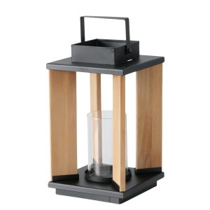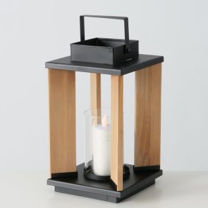Zwarte lantaarn in hout en metalen.