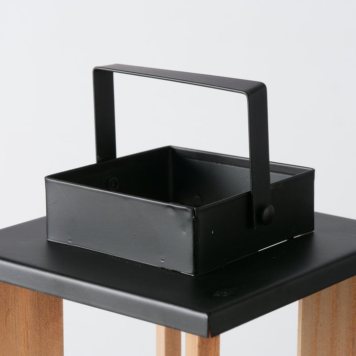 Zwarte lantaarn in hout en metalen.