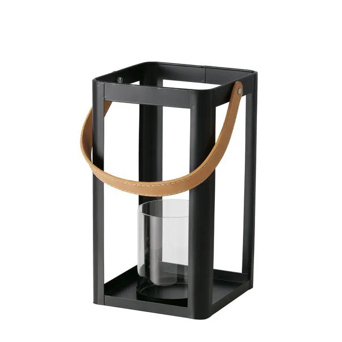 Zwarte metalen lantaarn met lederen handvat – Boltze | 15x18x25 cm