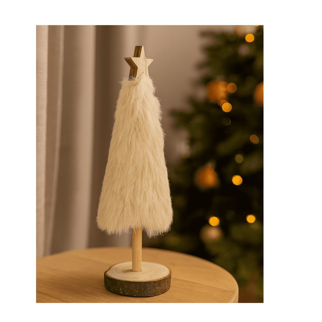 Breng warmte en sfeer in je interieur met deze stijlvolle decoratieve kerstboom. De boom heeft een natuurlijke houten basis en is afgewerkt met een zachte, pluche stof die een gezellige winterse uitstraling geeft. De houten ster aan de top maakt het geheel helemaal af.