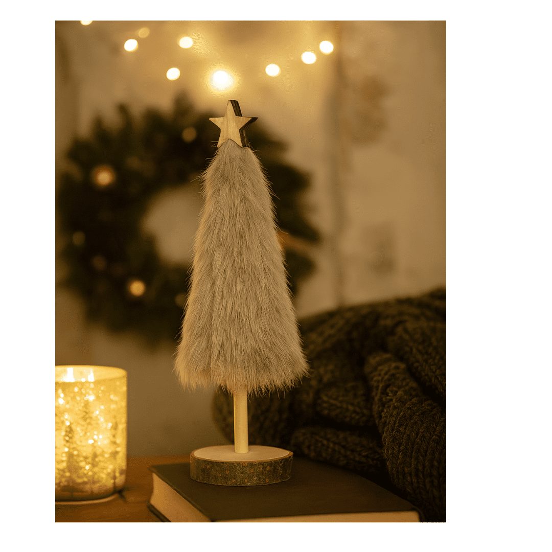 Breng warmte en sfeer in je interieur met deze stijlvolle decoratieve kerstboom. De boom heeft een natuurlijke houten basis en is afgewerkt met een zachte, pluche stof die een gezellige winterse uitstraling geeft. De houten ster aan de top maakt het geheel helemaal af.