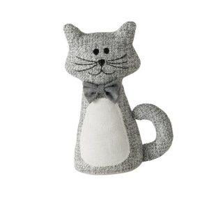 De deurstopper is gemaakt uit stof en in grijstinten met wit gecombineerd.