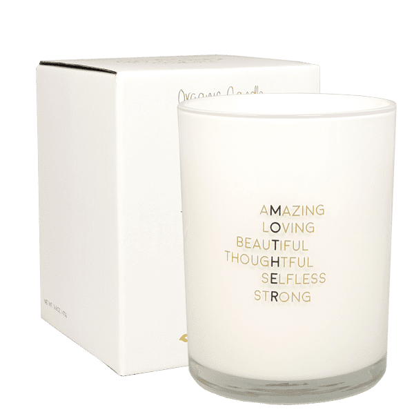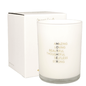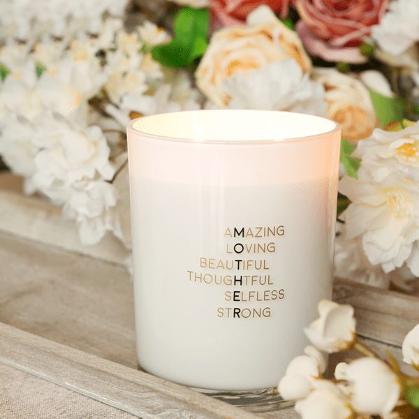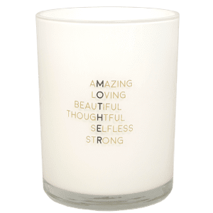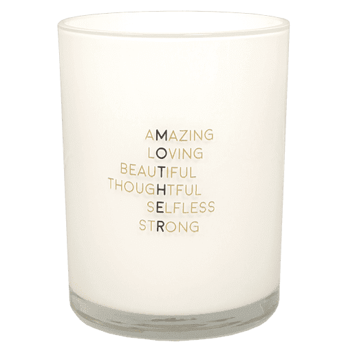 Dit is een grote, mooie geurkaars voor een hele lieve moeder. Op de kaars staan 6 mooie woorden onder elkaar die verticaal het woord ‘MOTHER’ spellen. Een prachtige kaars voor moederdag of zomaar om moeder even in het zonnetje te zetten.