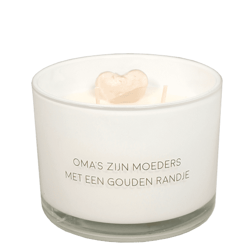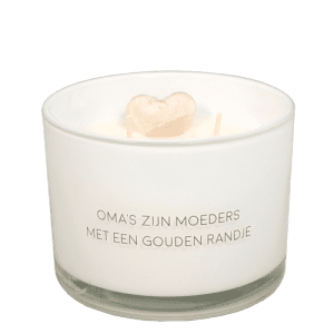 Een heerlijke geurkaars gemaakt van biologische sojawas. In deze kaars vind je een hartje gemaakt van sojawax. Op de kaars staat met gouden letters ‘Oma’s zijn moeders met een gouden randje’.