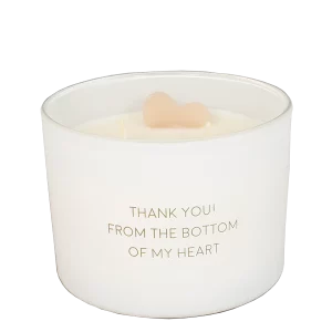 Een heerlijke geurkaars gemaakt van biologische sojawas. In deze kaars vind je een hartje gemaakt van sojawax. Op de kaars staat met gouden letters ‘Thank you from the bottom of my heart’.