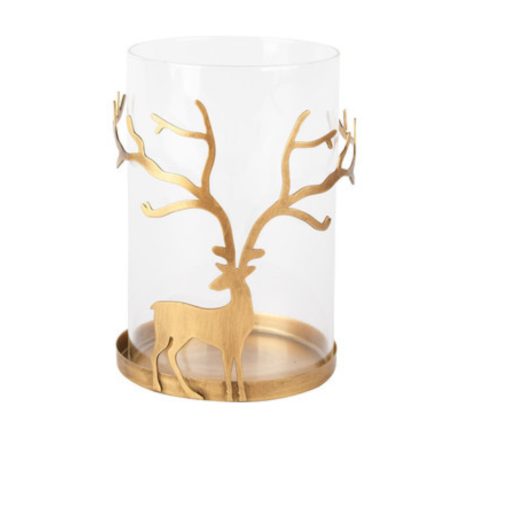 Breng warmte en elegantie in huis met deze stijlvolle theelichthouder van glas en metaal. De verfijnde gouden rendierdecoratie rondom het glas zorgt voor een luxe en feestelijke uitstraling. Wanneer het kaarslicht brandt, reflecteert het subtiel op het goud, waardoor een warme en gezellige gloed ontstaat.