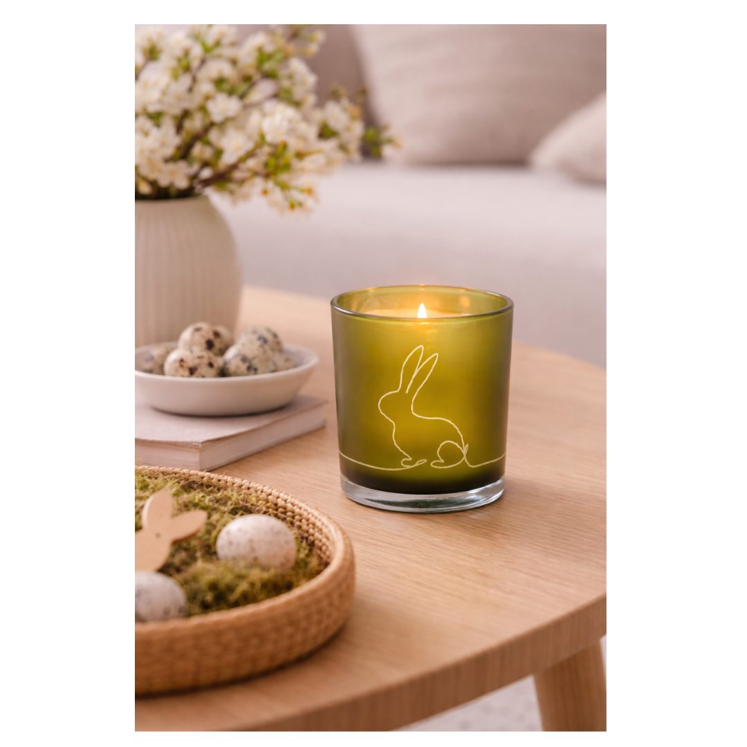 Deze sfeervolle theelichthouder van groen glas is versierd met een fijn lijntekening van een konijn. Wanneer het kaarsje brandt, komt het motief prachtig tot leven en zorgt het voor een zacht, warm licht.