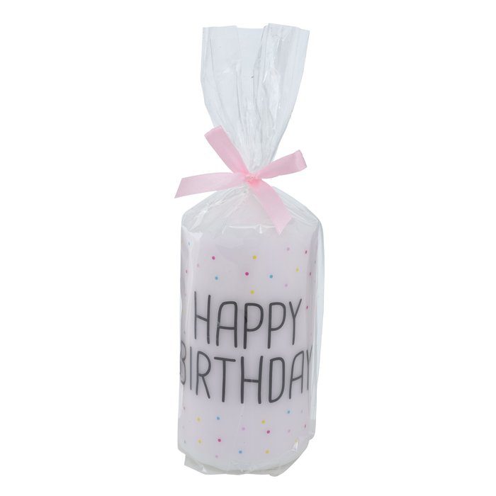 Kaars met tekst happy birthday en bolletjes in leuke pastelkleuren . Leuk en vooral handig om in huis te hebben want er is altijd wel iemand jarig .