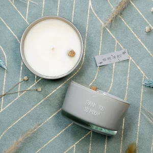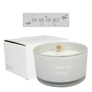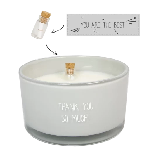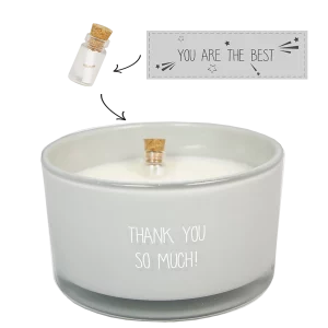 Op de geurkaars staat ‘Thank you so much!’. In de wax vind je een flesje met daarin een briefje. Voordat je de kaars brandt kan je het flesje uit de wax trekken, de kurk van het flesje en het briefje eruit halen. Op het briefje staat ‘You are the best’. Een mooi cadeau met een leuk complimentje.