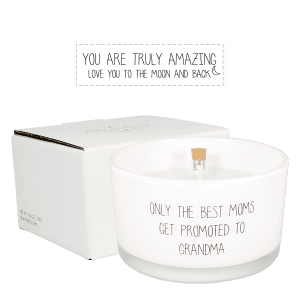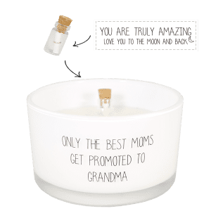 Op de geurkaars staat ‘Only the best moms get promoted to grandma’. In de wax vind je een flesje met daarin een briefje. Voordat je de kaars brandt kan je het flesje uit de wax trekken, de kurk van het flesje en het briefje eruit halen. Op het briefje staat ‘You are truly amazing. Love you to the moon and back’. Een mooi cadeau met een leuk complimentje.