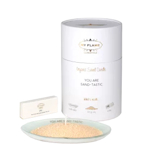 Breng warmte en gezelligheid in huis met deze prachtige giftbox met kaarsenzand. De set bestaat uit 200 gram biologisch kaarsenzand – goed voor zo’n 12 keer gebruik – en een stijlvolle witte schaal met de opdruk “ you are sand-tastic.