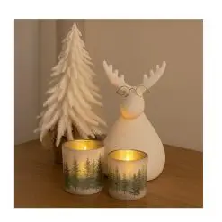 De set bestaat uit een wit rendier (17 cm), een realistisch kerstboompje met sneeuwaccenten (26 cm) en twee glazen theelichthouders met dennenmotief (8 en 13 cm).