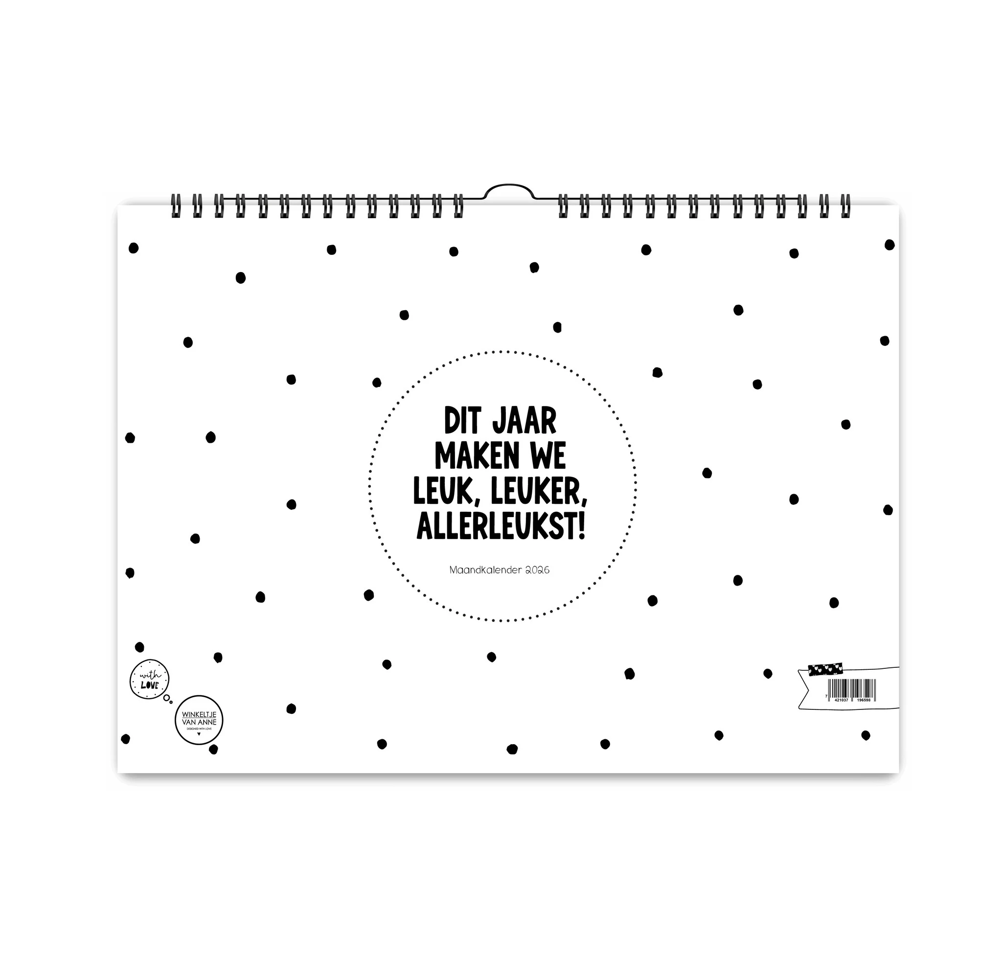 De kalender is 42 x 29,7 CM en voorzien van een zwarte ringband met ophanghaakje. De kalender is enkelzijdig gedrukt.