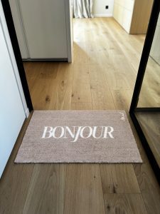 Deurmat Oscar uit de collectie Mad about mats met tekst Bonjour.