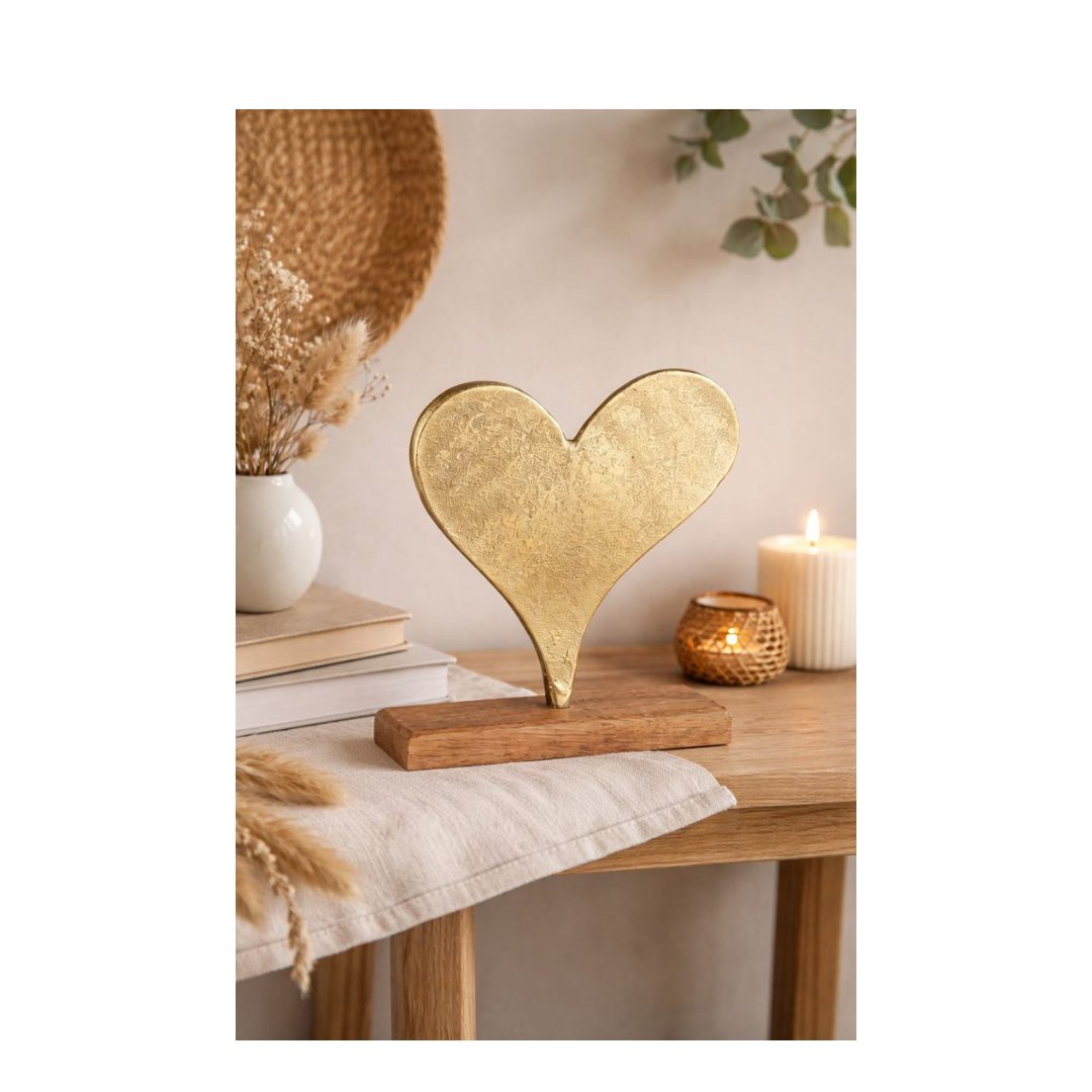 Dit metalen goudkleurig hart op houten voet is een stijlvolle en tijdloze toevoeging aan je interieur. Het decoratieve hart is vervaardigd uit metaal met een subtiel verweerde afwerking, wat zorgt voor een warme, ambachtelijke uitstraling. De natuurlijke houten voet geeft het geheel een rustige basis en maakt het object stabiel en duurzaam.