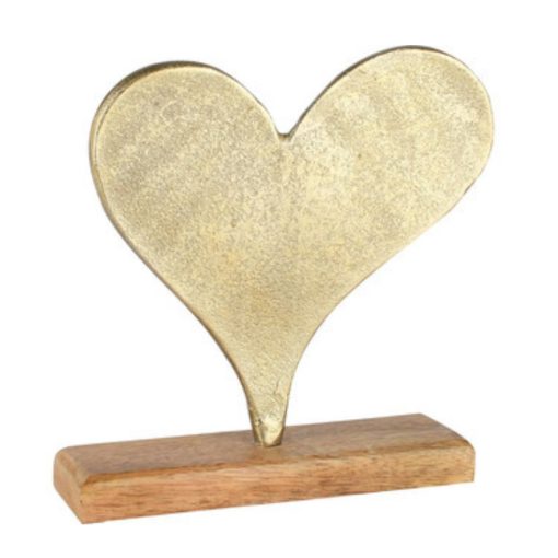 Decoratief metalen goudkleurig hart op houten voet.
