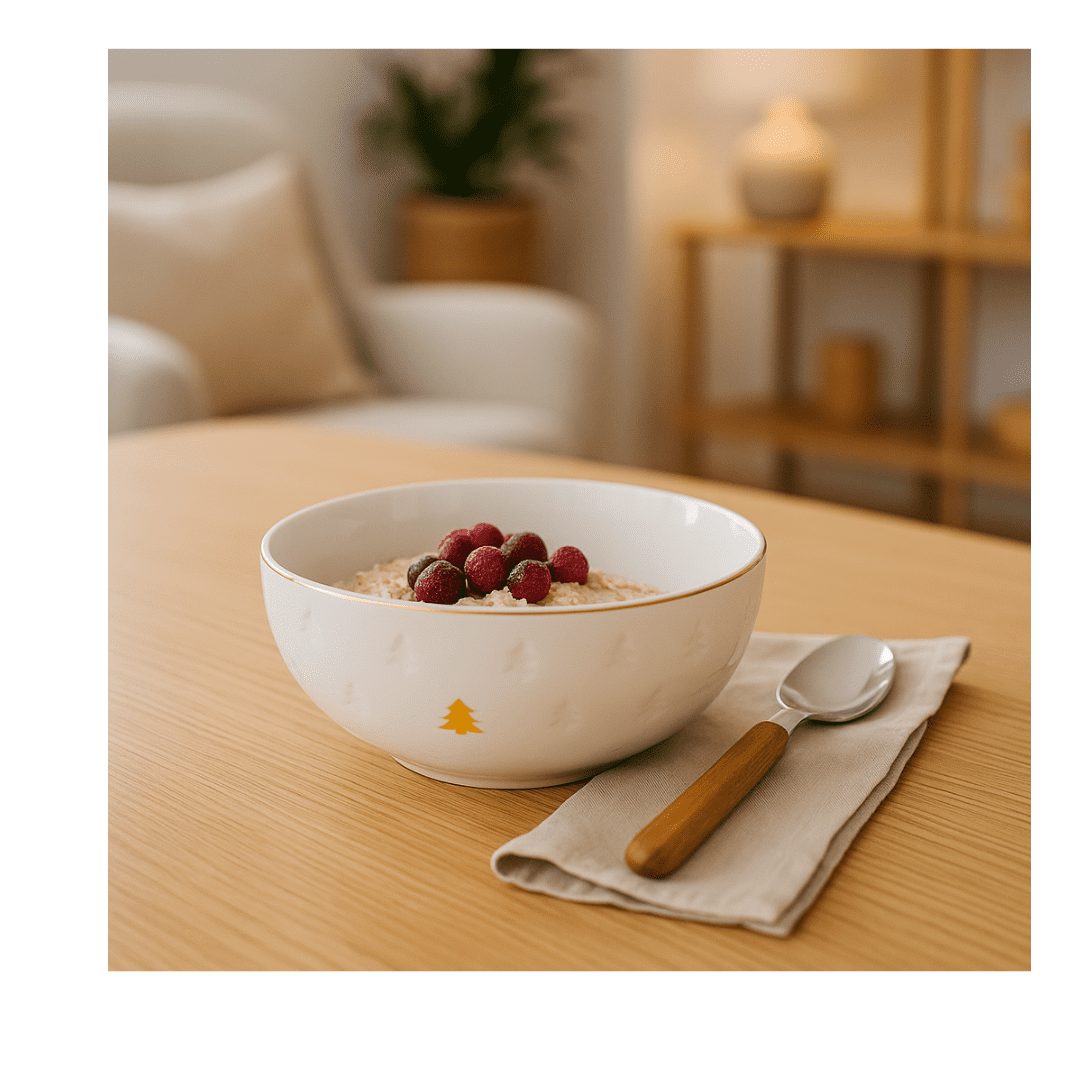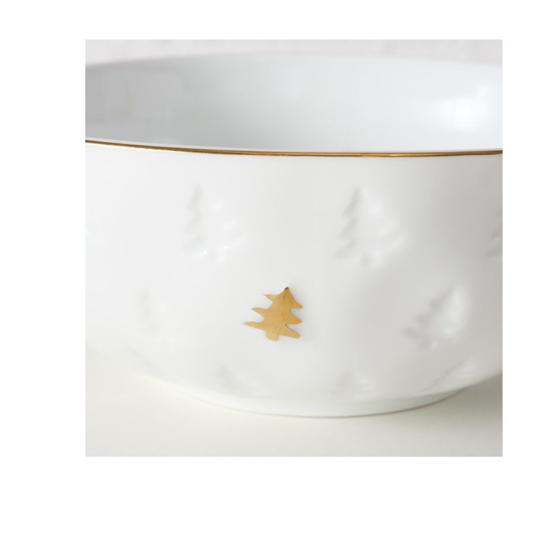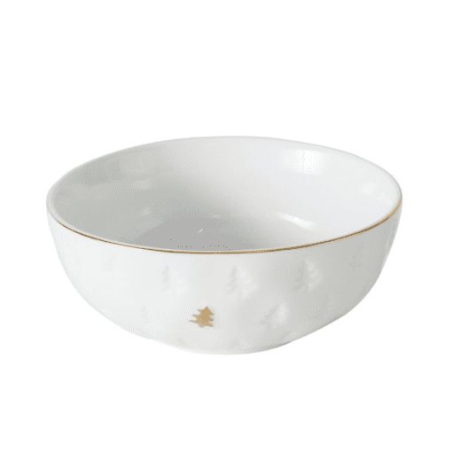 Begin je dag in stijl met deze elegante ontbijtkom van hoogwaardig porselein. De kom heeft een subtiel reliëf van kerstboompjes en een fijn goudkleurig accent langs de rand, wat zorgt voor een luxueuze en feestelijke uitstraling. Perfect om je ontbijt net dat tikkeltje specialer te maken tijdens de wintermaanden.