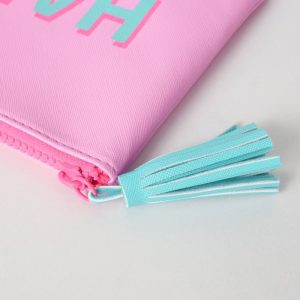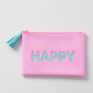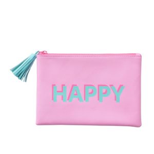 Vrolijk je dag op met deze stijlvolle make-up tas van Boltze in een opvallende roze kleur met blauw “HAPPY”-opschrift. Perfect voor het opbergen van make-up of kleine accessoires.