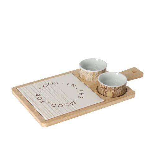 Deze plank van duurzaam bamboehout is voorzien van een tegel met print en twee ronde dipbakjes. Door de keramieken tegel krijgt deze plank een unieke uitstraling. Vul de bakjes met je favoriete dip en plaats deze in de handige inkeping. Combineer dit product met andere items uit de MOOD FOR FOOD lijn voor een stijlvol geheel!