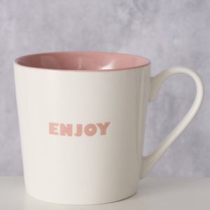 Leuke tas met tekst enjoy in keramiek van het merk Boltze. Deze leuke tas heeft een inhoud van 390ml, een roze binnenkant en roze opdruk.