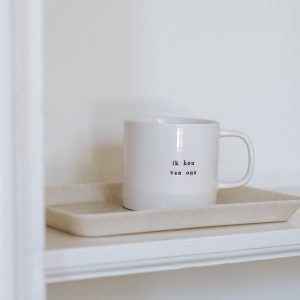 Geniet van je favoriete thee of koffie uit deze tas met de tekst Ik hou van ons. Deze unieke tas combineert een tijdloos zwart-wit design met een warme boodschap.