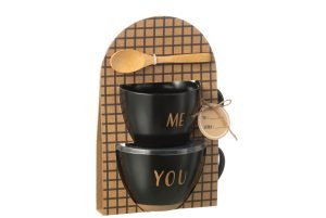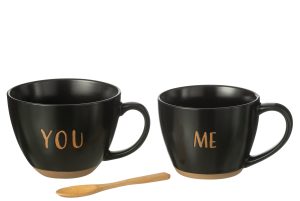 Set van 2 tassen in zwarte keramiek met tekst me – you , inclusief houten lepel