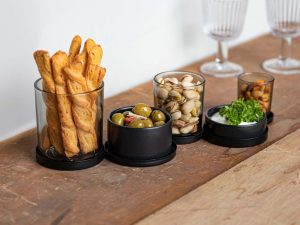 Set van 5 potjes op een metalen houder. De aperitiefschaal is gemaakt uit metaal en heeft plaats voor 5 potjes in zwart porselein en glas . De 5 potjes hebben elk een verschillende afmeting wat het geheel compleet maakt. Het contrast tussen het metaal en zwart oogt mooi en past in elke keuken .