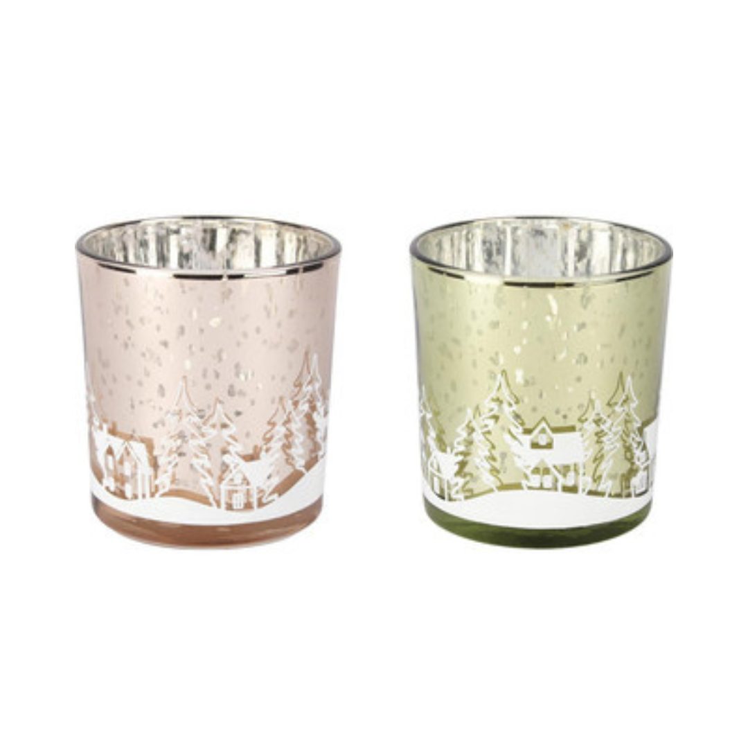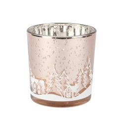 Sfeervolle theelichthouder in roze (7×8 cm) met een mooi wintertafereel.