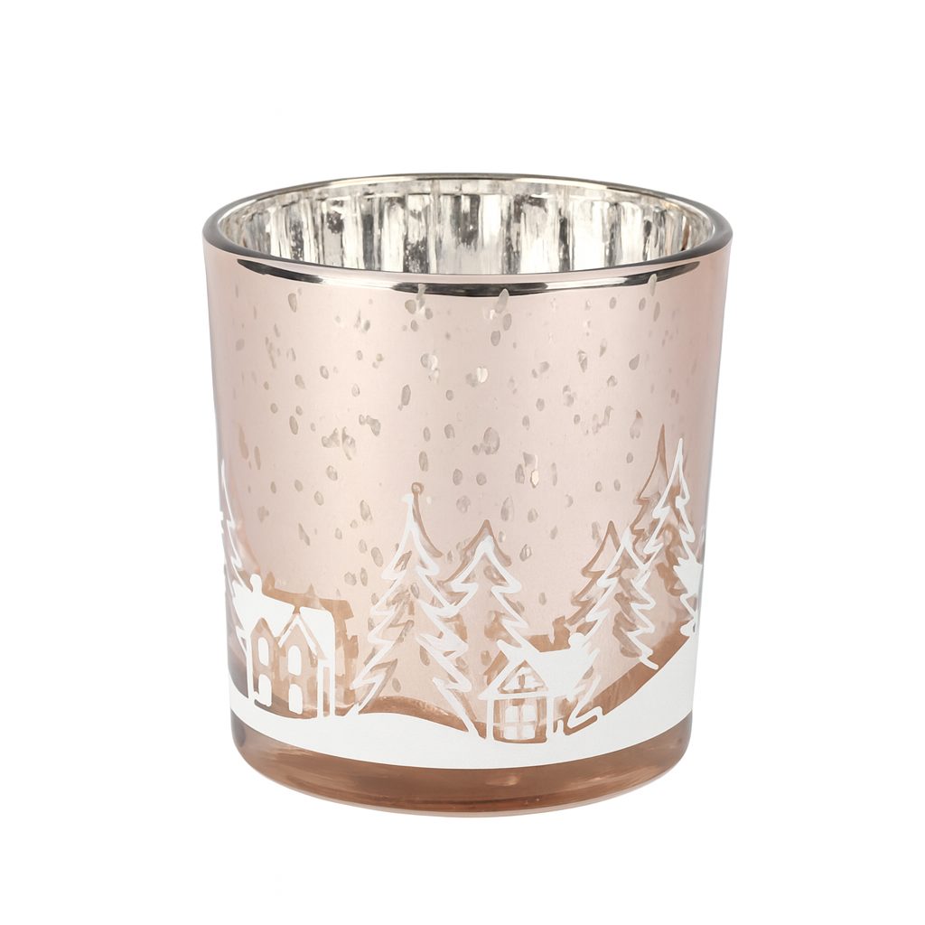 Creëer direct warmte en gezelligheid met deze prachtige theelichthouder in roze (7×8 cm). De subtiele metallic glans en het fijne wintertafereel met bomen en huisjes zorgen voor een sfeervol lichtspel zodra het theelichtje wordt aangestoken. Deze glazen houder past perfect binnen winterdecoratie, kerststyling en een knus, modern interieur.
