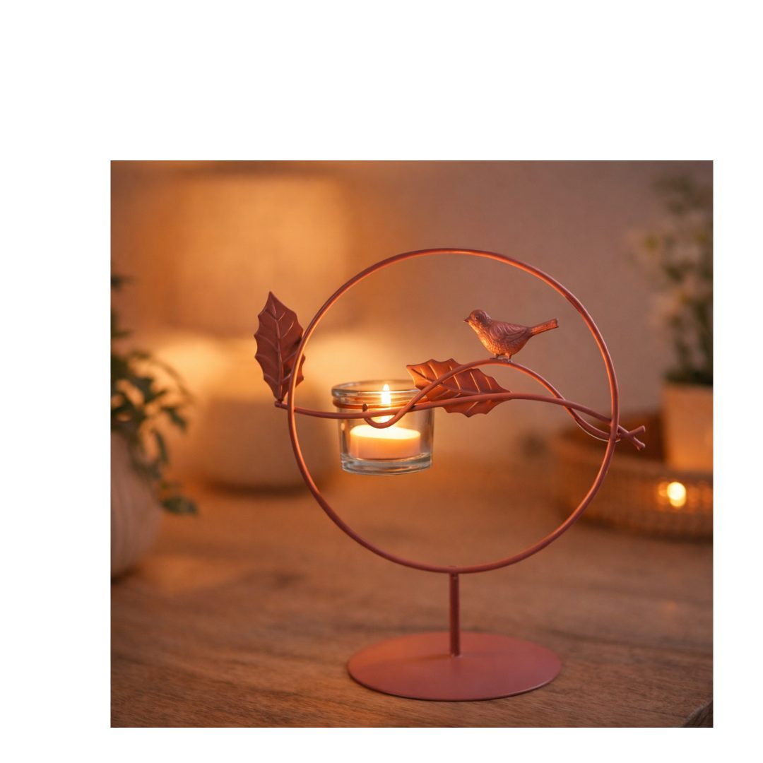 Metalen roze theelichthouder in cirkel met sierlijke vogel voor een warme en decoratieve lichtsfeer.