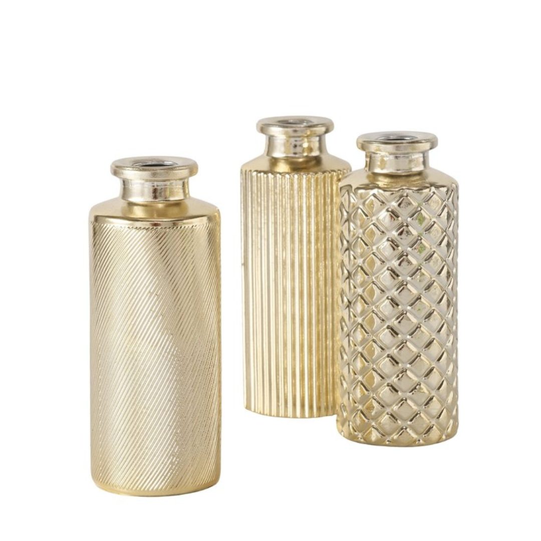 Set van 3 goudkleurige vaasjes (5 x 13 cm) met verschillende patronen.