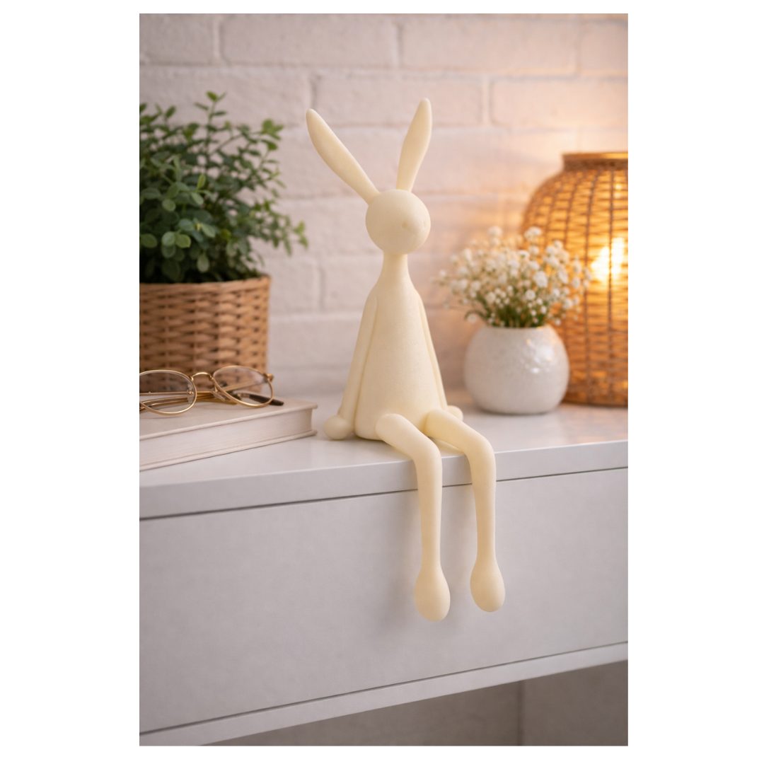 Dit zittend konijn in vilt is een stijlvol en speels decoratiebeeld met een minimalistische uitstraling. Het slanke ontwerp en de zachte kleur geven het konijn een rustige, moderne look die moeiteloos past in verschillende interieurstijlen. Door de lange oren en bungelende poten heeft het beeld een charmant en luchtig karakter.