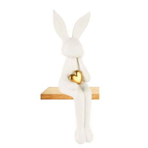 Het konijn houdt een goudkleurig hart vast, symbool voor liefde en warmte. De combinatie van het rustige wit met de warme goudtinten zorgt voor een elegant en speels geheel. Perfect als decoratie op een dressoir, vensterbank, bijzettafel of in een open kast. O