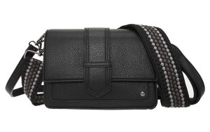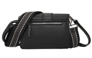 Deze elegante zwarte handtas is de perfecte combinatie van stijl en functionaliteit. De tas wordt geleverd met twee draagriemen: een smalle, in bijpassende kleur, en een brede, verstelbare schouderriem met een opvallend grafisch patroon. Zo kun je de tas op meerdere manieren dragen – zowel chic als casual.