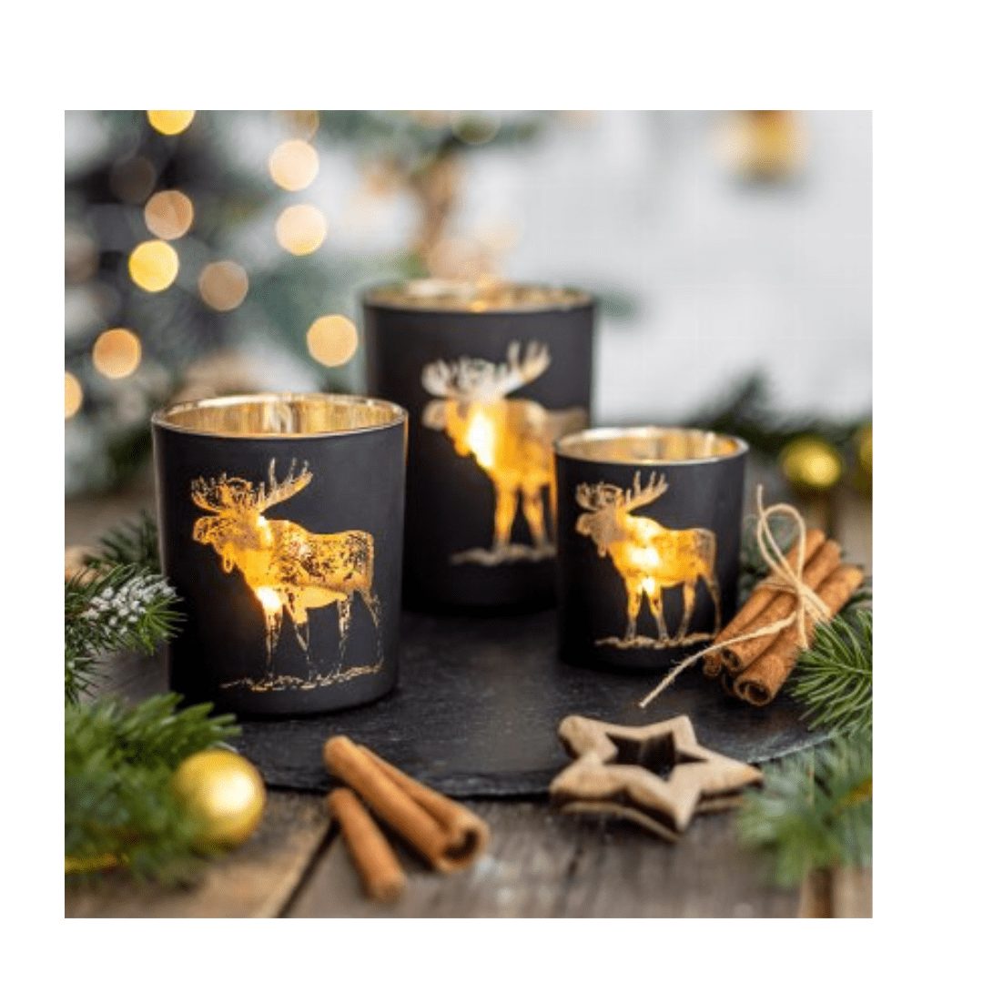 Breng warmte en sfeer in huis met deze stijlvolle theelichthouder. Het matzwarte glas is versierd met een elegant goudkleurig rendiermotief dat prachtig oplicht zodra je een kaarsje aansteekt. De subtiele glans zorgt voor een gezellige en feestelijke uitstraling — perfect voor de winter en kerstperiode.